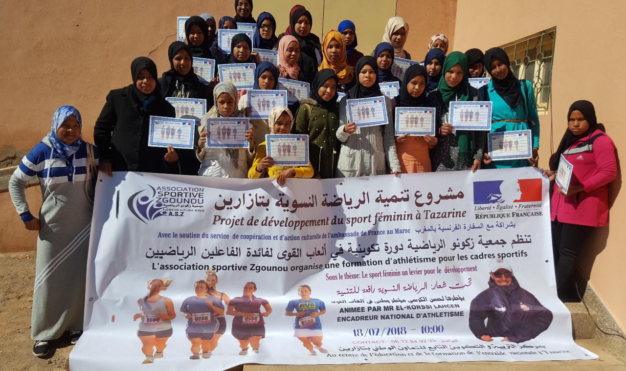 تحت شعار: “الرياضة النسوية رافعة للتنمية “، و في إطار تنزيل أنشطة “مشروع تنمية الرياضة النسوية بتازارين”، بشراكة مع السفارة الفرنسية بالمغرب ضمن برنامج بيسكا لسنة 2017 للمشاريع المبدعة للمجتمع المدني و ائتلاف الفاعلين، نظمت جمعية زكونو الرياضية بفضاء مركز التربية و التكوين التابع للتعاون الوطني بتازارين إقليم زاكورة، يوم الأحد 18 فبراير 2018، دورة تكوينية في ألعاب القوى لفائدة الفاعلين الرياضيين و الممارسات و الممارسين لسباقات ألعاب القوى بالمنطقة.