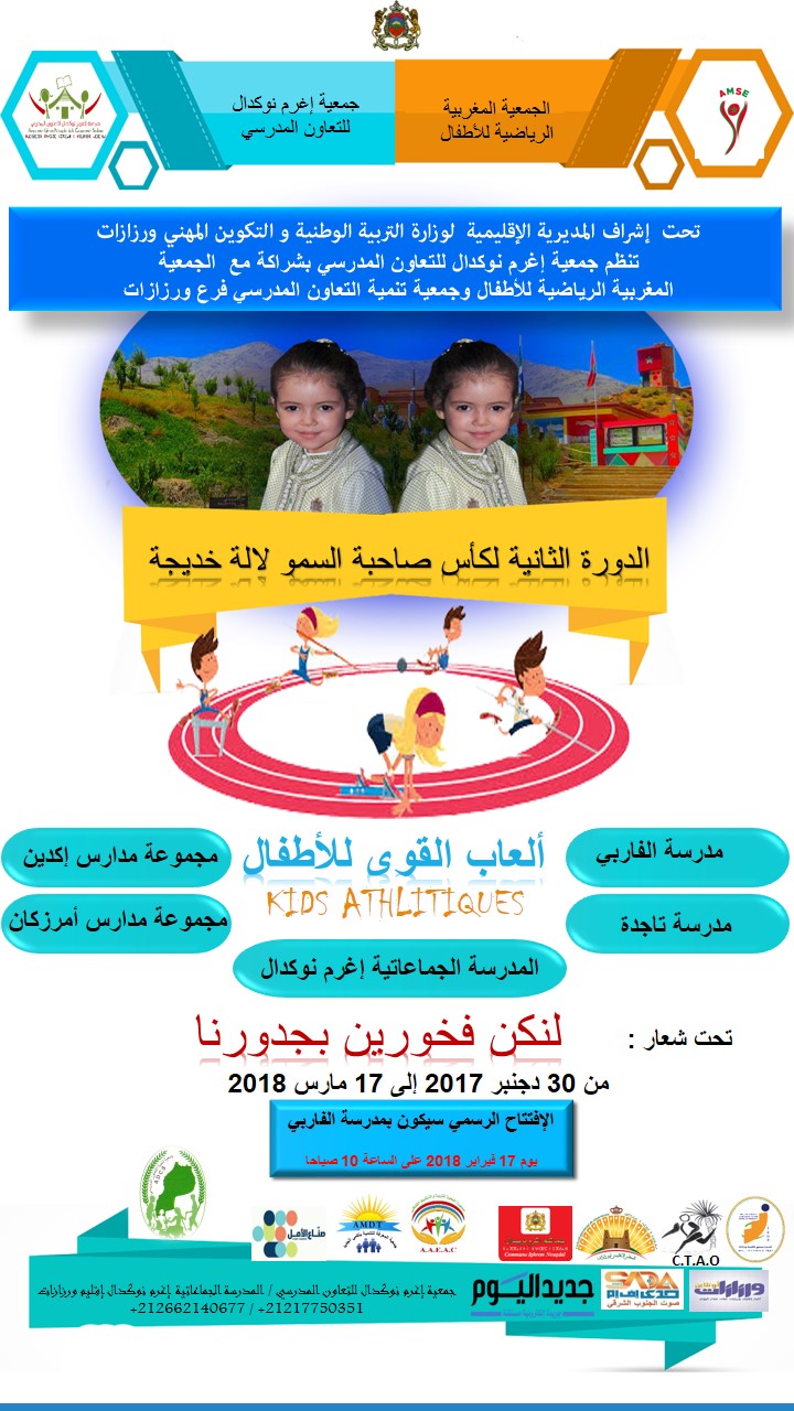 تحت شعار ” لنكن فخورين بجدورنا ” وسعيا منها لرد الاعتبار للحياة المدرسية وخاصة الرياضة والمساهمة في بناء أبطال الغد، تنظم جمعية إغرم نوكدال لتنمية التعاون المدرسي الدورة الدورة الثانية لكأس صاحبة السمو الأميرة لآلة خديجة لألعاب القوى للأطفال بشراكة مع الجمعية المغربية الرياضية للأطفال، تحت إشراف المديرية الإقليمية لوزارة التربية الوطنية والتكوين المهني بورزازات.