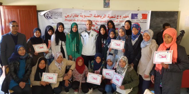 احتفاء باليوم العالمي للرياضة النسوية الذي يصادف الـ24 من شهر يناير من كل سنة ميلادية، و تحت شعار: ” الرياضة النسوية رافعة للتنمية “، نظمت جمعية زكونو الرياضية اليوم الأحد 11 فبراير 2018، بمركز التربية و التكوين التابع للتعاون الوطني بتازارين إقليم زاكورة، دورة تكوينية في قوانين تحكيم الكرة المستديرة على البساط الأخضر، لفائدة الفاعلين الرياضيين من كلا الجنسين، في إطار مشروع ” تنمية الرياضة النسوية بتازارين ” بشراكة مع السفارة الفرنسية بالمغرب، و ذلك ضمن برنامج المشاريع المبدعة التي تعمل عليها منظمات المجتمع المدني و ائتلاف الفاعلين الذي يصطلح عليه بالفرنسية PISCCA “بيسكا” لسنة 2017.