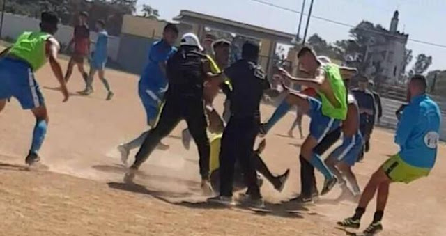 تعرض حكم في إحدى مباريات دوري الهواة لاعتداء شنيع من قبل لاعبي أحد الأندية، أنهالوا عليه بالركل والرفس، كما تظهر الصورة.