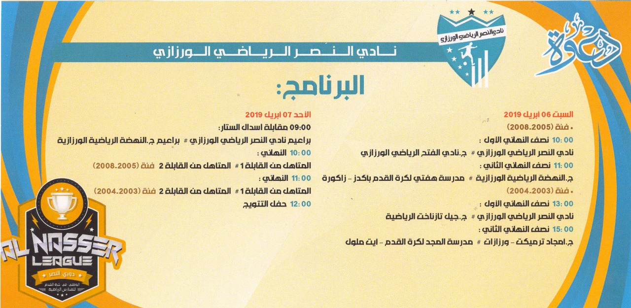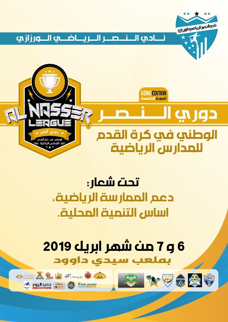 تحت شعار “دعم الممارسة الرياضية أساس التنمية المحلية” ينظم نادي النصر الورزازي دوري النصر الوطني في كرة القدم للمدارس الرياضية وذلك أيام 6 و7 أبريل الجاري بملعب سيدي داود بورزازات.