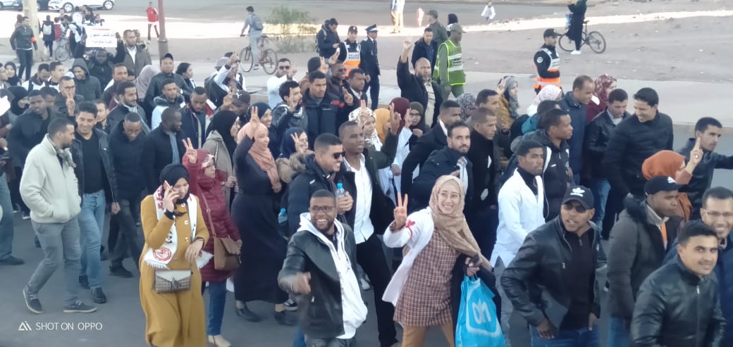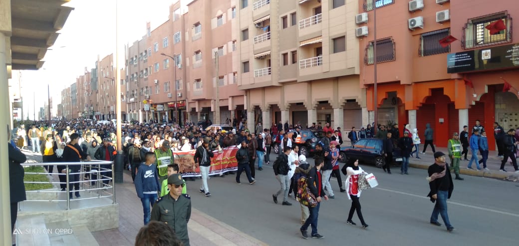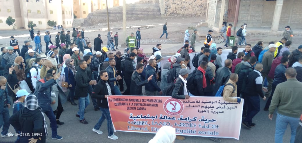وخلال هذه المسيرة التي شارع فيها ازيد من 400 استاذ واستاذة وبعض الاطارات النقابية، رفعت خلالها شعارات ولافتات تندد بوضعية هاته الفئة والمطالبة بإسقاط نظام التعاقد مطالبون بالإدماج.