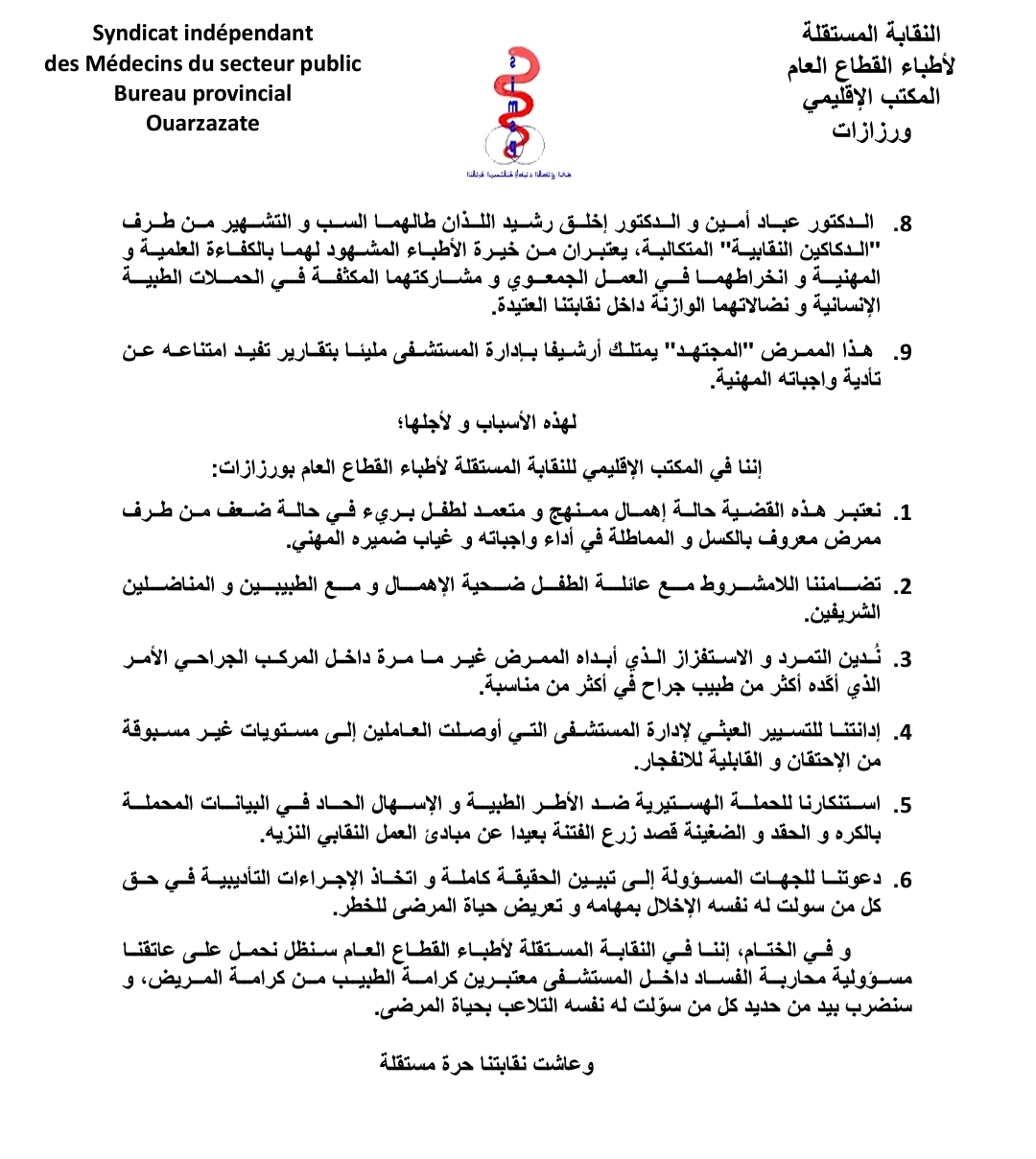من جهته قال المكتب الإقليمي للنقابة المستقلة لأطباء القطاع العام بورزازات في بيان توصلت درعة.أنفو بنسخة منه، أن الممرض أصر على المماطلة وعدم تقديم المساعدة للطفل المريض، بالرغم من تنبيهه من طرف الطبيب الجراح و الحارس العام ومدير المستشفى ورئيسه المباشر طبيب الإنعاش والتخدير.