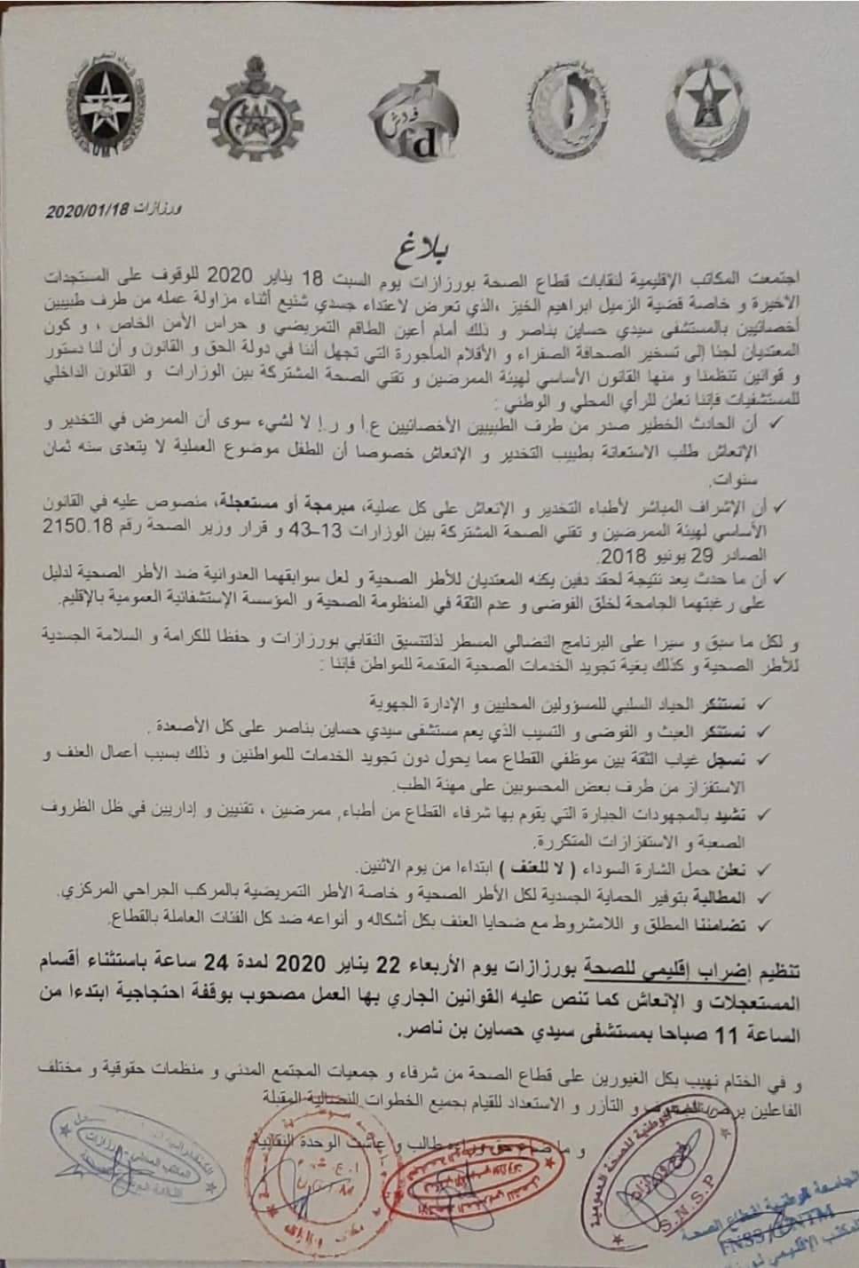 دعت المكاتب الإقليمية لنقابات قطاع الصحة بورزازات إلى تنظيم اضراب إقليمي للصحة بورزازات يوم الأربعاء 22 يناير الجاري، مصحوبا مع وقفة احتجاجية بمستشفى سيدي حساين بناصر، وذلك بعد الحادث الدي شهده المركب الجراحي بالمستشفى.