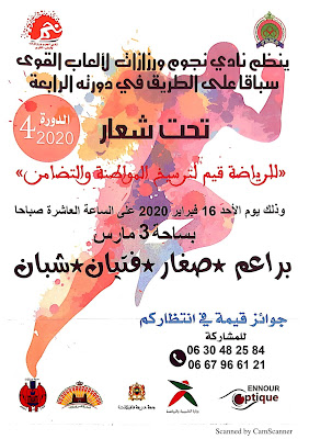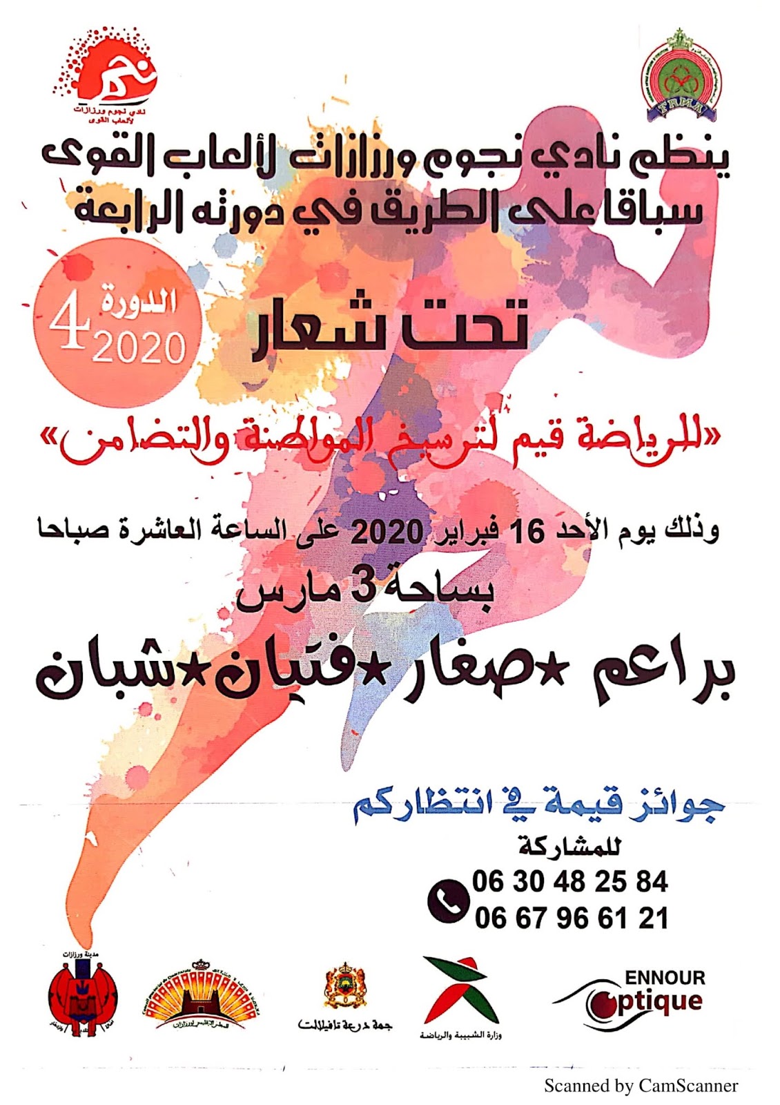 تحت إشراف الجامعة الملكية المغربية لألعاب القوى ينظم نادي نجوم ورزازات لألعاب القوى الدورة الرابعة للسباق على الطريق، وذلك يوم الأحد 16 فبراير الجاري بداية من الساعة العاشرة صباحا بساحة 3 مارس بورزازات.