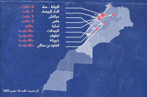 ولم تُسجل أي حالة إصابة بفيروس كورونا المستجد بجهة درعة تافيلالت، فيما تتصدر الرباط سلا قائمة عدد الإصابات بـ9 حالات، تليها مدينة الدار البيضاء بـ 7 حالات، ومراكش بـ3 حالات، وفاس بـ3 حالات، مع حالتين بتمارة، وحالة واحدة في تارودانت، وحالة واحدة في تطوان، وحالة واحدة في خريبكة، وحالة واحدة في لفقيه بنصالح.