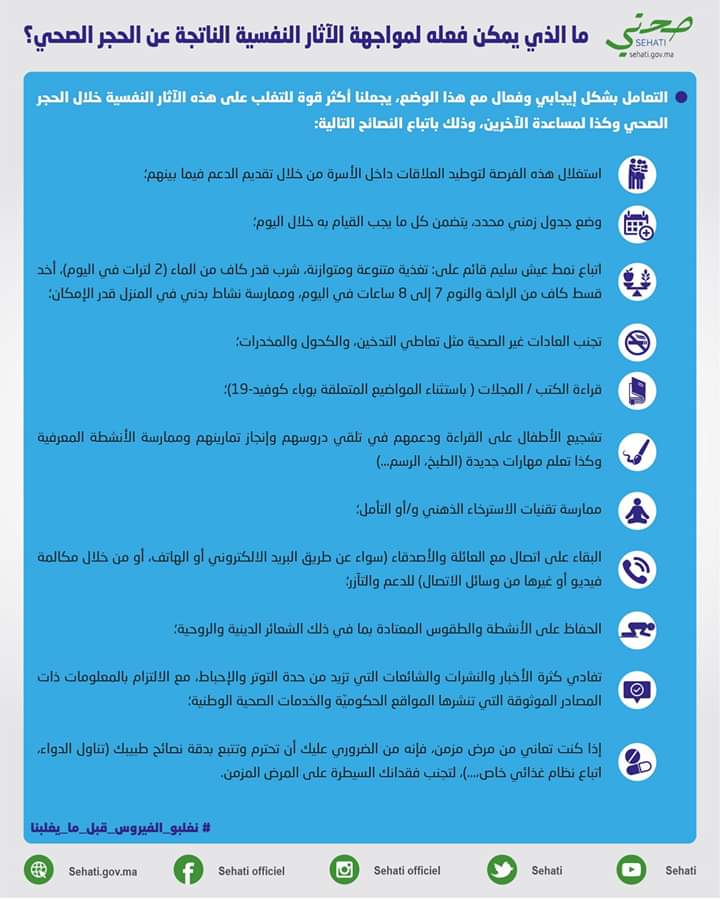 التعامل بشكل إيجابي وفعال مع هذا الوضع، يجعلنا أكثر قوة للتغلب على هذه الآثار النفسية خلال الحجر الصحي وكذا لمساعدة الآخرين، وذلك باتباع النصائح التالية: