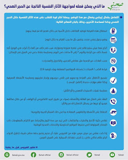 تفادي كثرة الأخبار والنشرات والشائعات التي تزيد من حدة التوتر والإحباط، مع الالتزام بالمعلومات ذات المصادر الموثوقة التي تنشرها المواقع الحكومية والخدمات الصحية الوطنية.