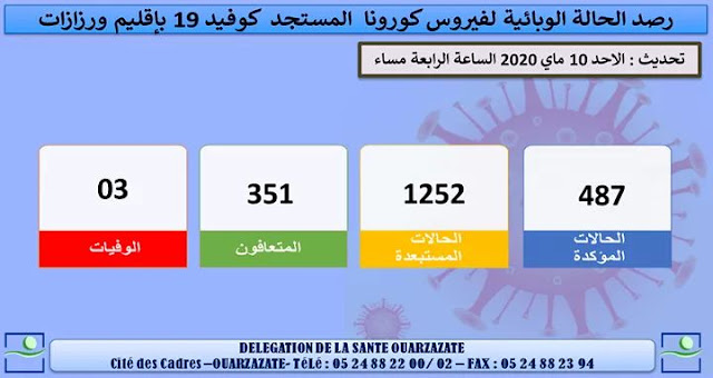 أعلنت المديرية الإقليمية بورزازات، أنه ارتفعت، إلى حدود الساعة الرابعة من مساء اليوم الأحد، حالات الإصابات المؤكدة بفيروس كورونا المستجد (كوفيد-19) على مستوى الاقليم، إلى 487 حالة، بعد تسجيل 7 حالات جديدة خلال ال 24 ساعة الماضية.