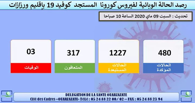 وحسب الحصيلة اليومية لتطور الوضعية الوبائية للفيروس بالاقليم، فقد بلغ عدد الحالات المستبعدة بعد تحليل مخبري سلبي حول احتمال الإصابة بفيروس كورونا المستجد (كوفيد-19)، على مستوى إقليم ورزازات، 1227 حالة، فيما سجلت الى حدود الساعة 3 وفيات منذ بداية انتشار الفيروس بالاقليم.