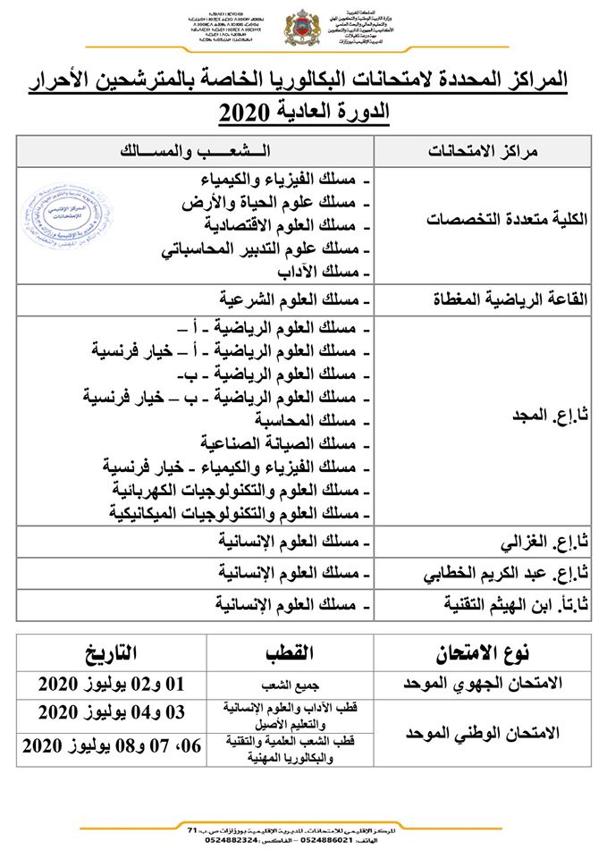 وفيما يلي المراكز المحدد لإمتحانات نيل شهادة البكالوريا دورة 2020 الخاصة بالمترشحات والمترشحين الأحرار بإقليم ورزازات: