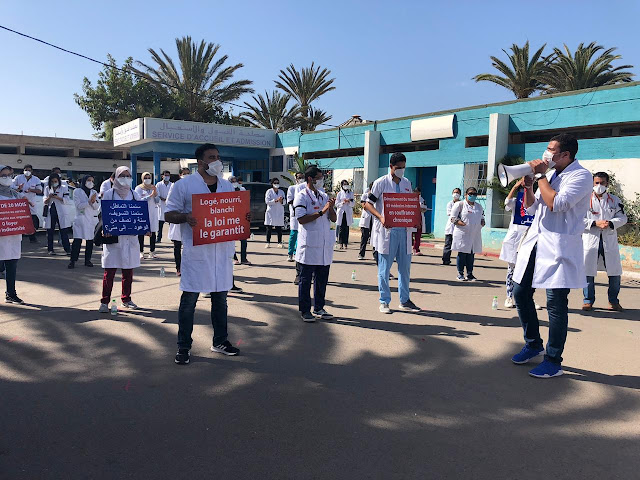 نظم الأطباء الداخليون التابعون للمستشفى الجامعي بأگادير وقفة احتجاجية داخل المستشفى الجهوي الحسن الثاني بأگادير ابتداء من الساعة الحادية عشرة ليومه الإثنين 19/10/2020 وذلك للتنديد بسياسة التسويف وسد الآذان أمام مطالبهم التي تضمنها ملفهم المطلبي والتي لخصوها في بيانهم رقم1-الذي توصلنا به سابقًا- وطالبوا مختلف الجهات بضرورة الإسراع بالاستجابة لها، بدء بتوفير الأكل وانتهاء بالسكن اللذين يعتبران حقا مشروعا وقانونيا للطبيب الداخلي .لتصدر جمعيتهم بعد ذلك بيانا رقم 2- توصلنا بنسخة منه- قرروا خلاله تنفيذ أول محطة نضالية ضمن أشكال نضالية هددوا باللجوء إليها في حالة إهمال مطالبهم، وهو ما تم بالفعل يومه هذا حيث رفعوا شعارات منددة بعدم الاستجابة لانتظاراتهم وحملوا كذلك لافتات توضح بعضًا من نقط ملفهم المطلبي سواء لوزارة الصحة أو مرافقها الاقليمية والجهوية. هذه الوقفة الاحتجاجية التي عرفت استجابة واسعة للأطباء الداخليين الذين أبانوا عن حس تنظيمي عال، وفي احترام تام للشروط الاحترازية التي فرضتها الظروف الوبائية.
