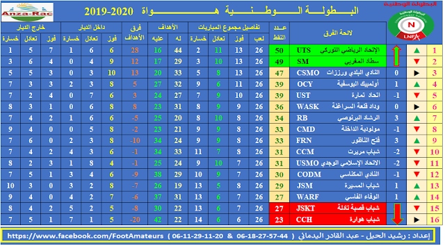 الترتيب العام للبطولة الوطنية هـــواة بعد إجراء جميع مباريات الدورة 26: