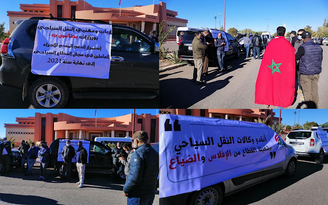 ورفع مهنيو النقل السياحي بورزازات، لافتات مطالبين بإنقاذ وكالات النقل السياحي وشغيلة القطاع من الإفلاس والضياع، وبإنشاء خط جوي يربط بين برشلونة الإسبانية بورزازات، واستمرار الدعم المقدم للأجراء العاملين في القطاع السياحي إلى نهاية سنة 2021.