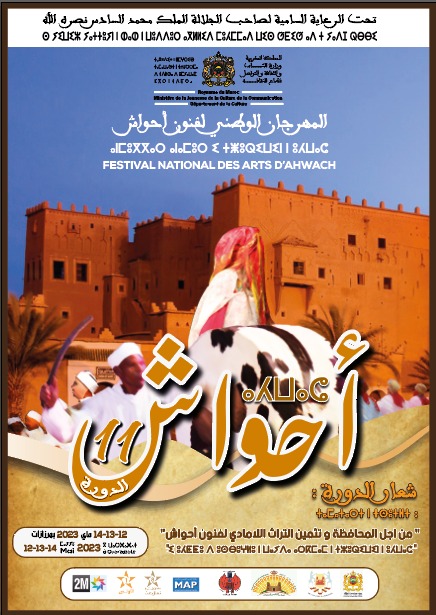 تحت الرعاية السامية لصاحب الجلالة الملك محمد السادس نصره الله وأيده ، وفي اطار العناية بالتراث اللامادي ، تنظم وزارة الشباب و الثقافة و التواصل – قطاع الثقافة – الدورة الحادية عشرة للمهرجان الوطني لفنون أحواش تحت شعار : من أجل المحافظة على التراث اللامادي لفنون أحواش بتعاون ودعم من عمالة اقليم ورزازات ، جهة درعة تافيلالت ، المجلس الإقليمي لورزازات ، المجلس الجماعي لورزازات ، والمعهد المتخصص للتكنولوجيا التطبيقية والفندقية والسياحية بورزازات ، وذلك أيام 12 و 13 و 14 ماي 2023 بمدينة ورزازات .