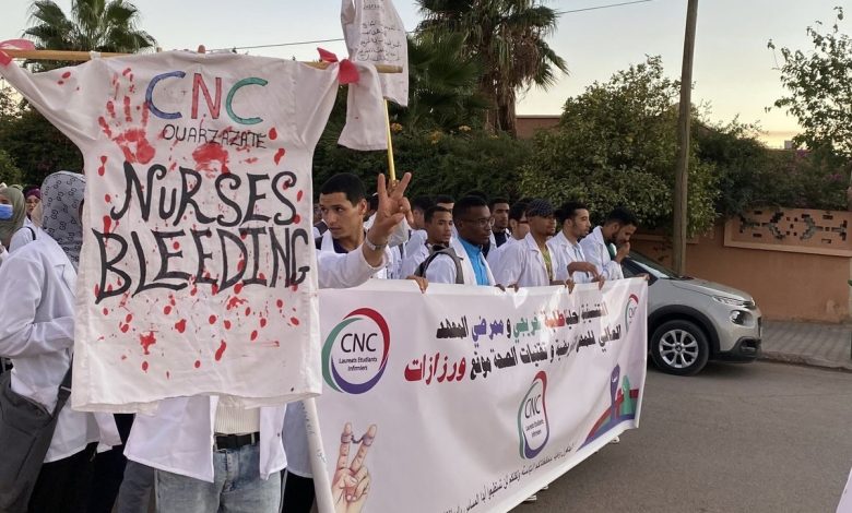 شهدت مدينة ورزازات مساء الاثنين 3 نونبر 2025 تنظيم مسيرة الكرامة من طرف التنسيقية المحلية لطلبة خريجي وممرضي المعاهد العليا للمهن التمريضية وتقنيات الصحة بورزازات، وذلك في إطار الخطوات التصعيدية التي أعلنت عنها التنسيقية تنفيذا لمخرجات البيان الوطني، وانطلقت المسيرة من مقر المعهد في اتجاه مندوبية الصحة وسط مشاركة واسعة من الطلبة والممرضين الذين رفعوا شعارات تطالب بالتعويض عن التداريب الاستشفائية وتوفير المناصب المالية الكافية لجميع الخريجين