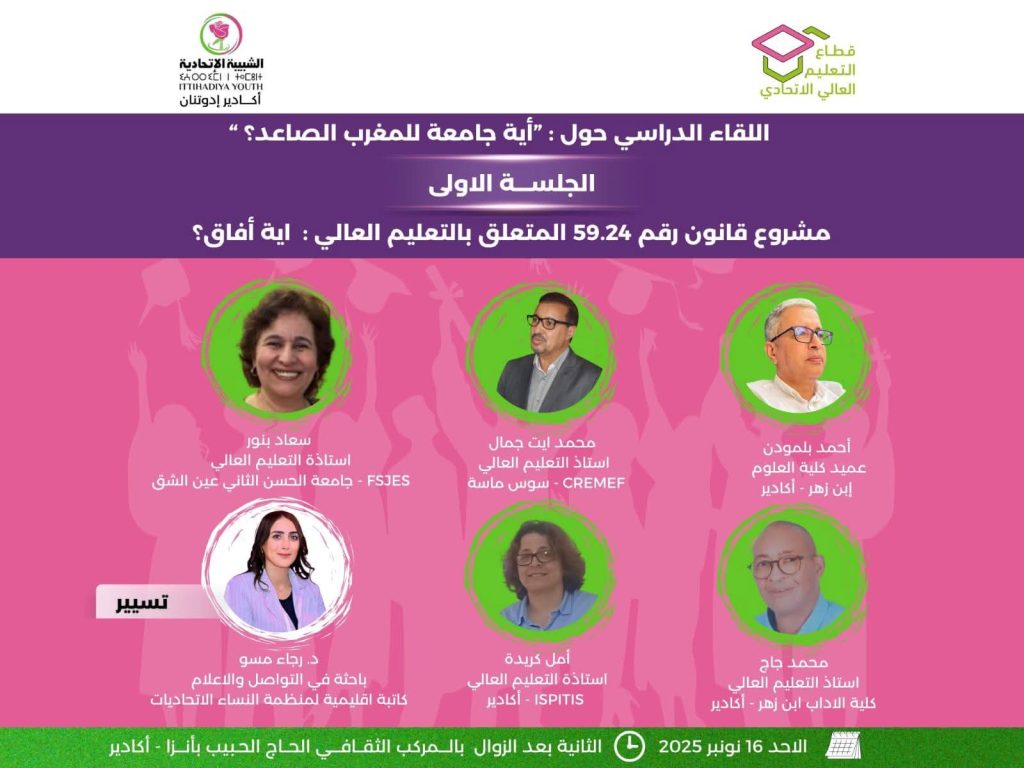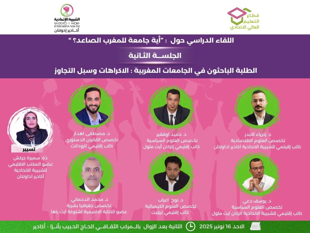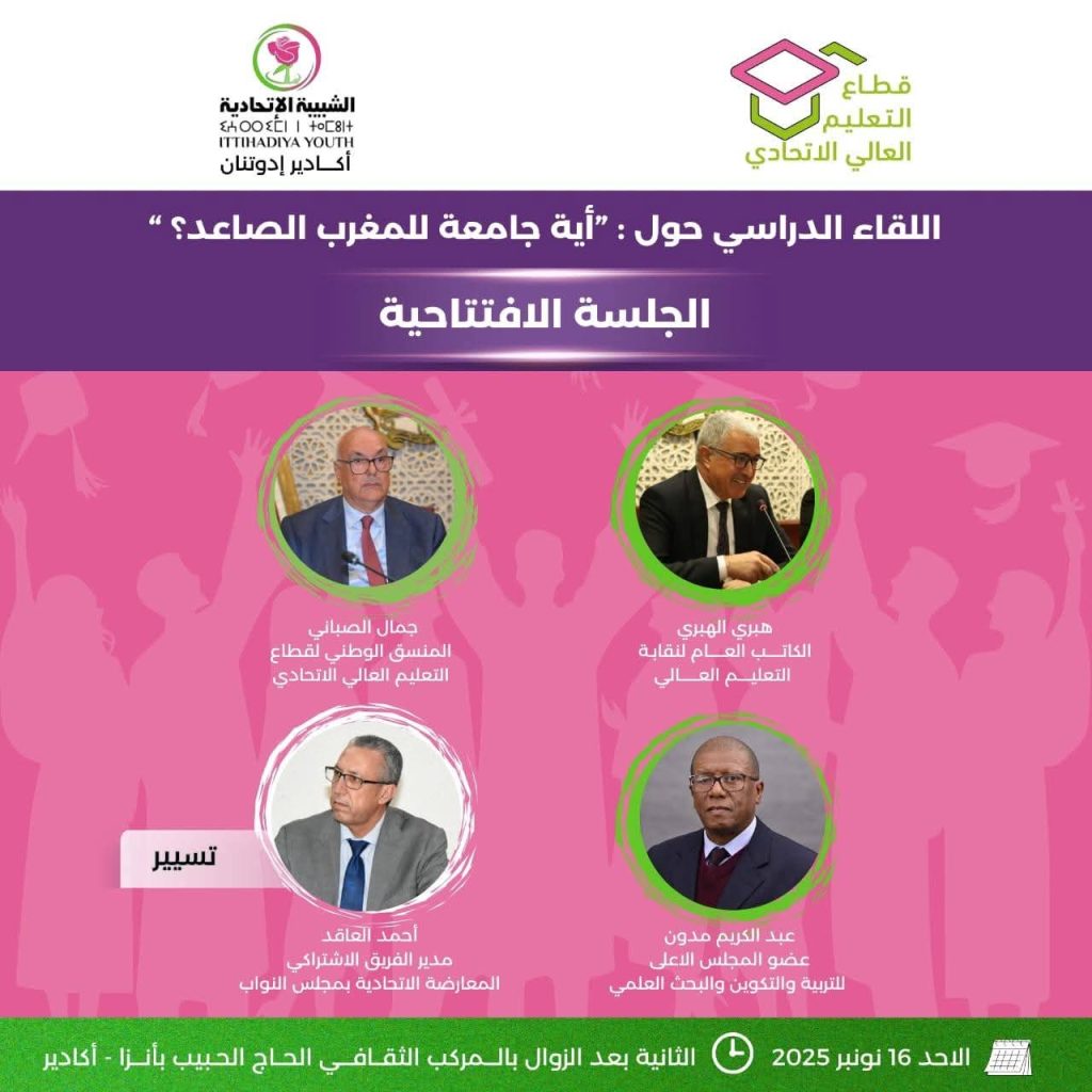 من المنتظر أن يحتضن المركب الثقافي الحاج الحبيب بأنزا بمدينة أكادير، يوم الأحد 16 نونبر 2025، أشغال اللقاء الدراسي الذي ينظمه قطاع التعليم العالي الاتحادي التابع لـ الشبيبة الاتحادية بأكادير إداوتنان، تحت شعار “أية جامعة للمغرب الصاعد؟”، بمشاركة نخبة من الأساتذة الجامعيين والباحثين وفاعلين في الشأن الأكاديمي والتربوي.
